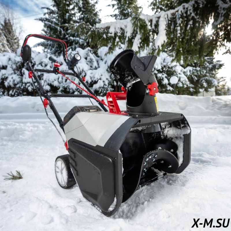 Удобная рукоятка, расположенная за желобом, облегчает подъём и перемещение снегоуборщика.